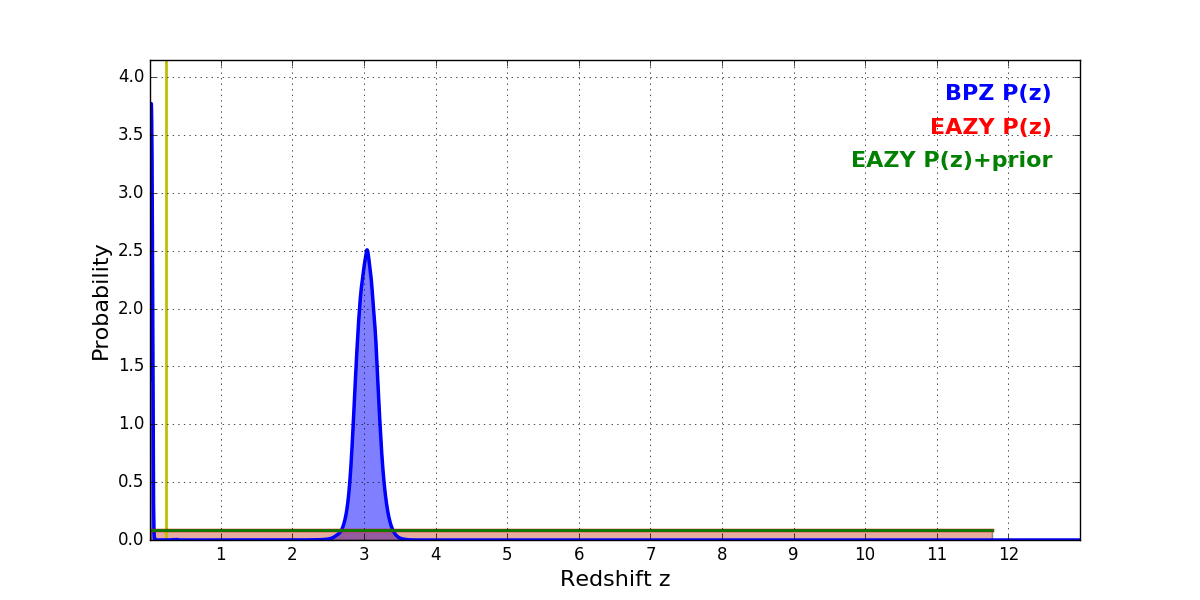 In P(z) plots: Yellow lines mark the cluster redshift z = 0.228,