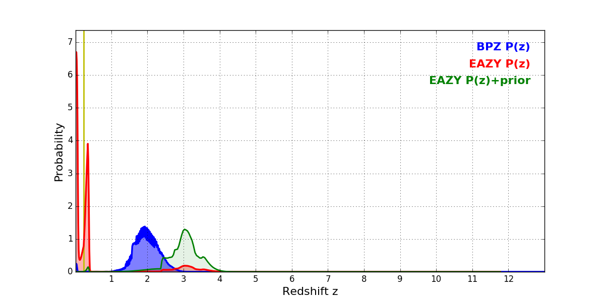 In P(z) plots: Yellow lines mark the cluster redshift z = 0.228,