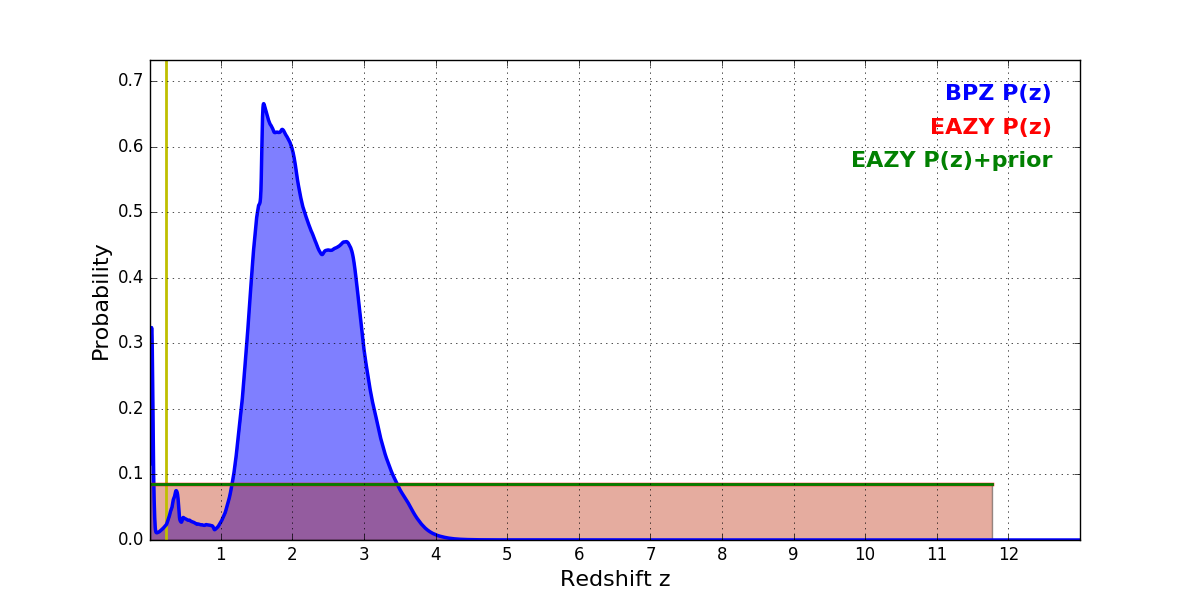 In P(z) plots: Yellow lines mark the cluster redshift z = 0.228,