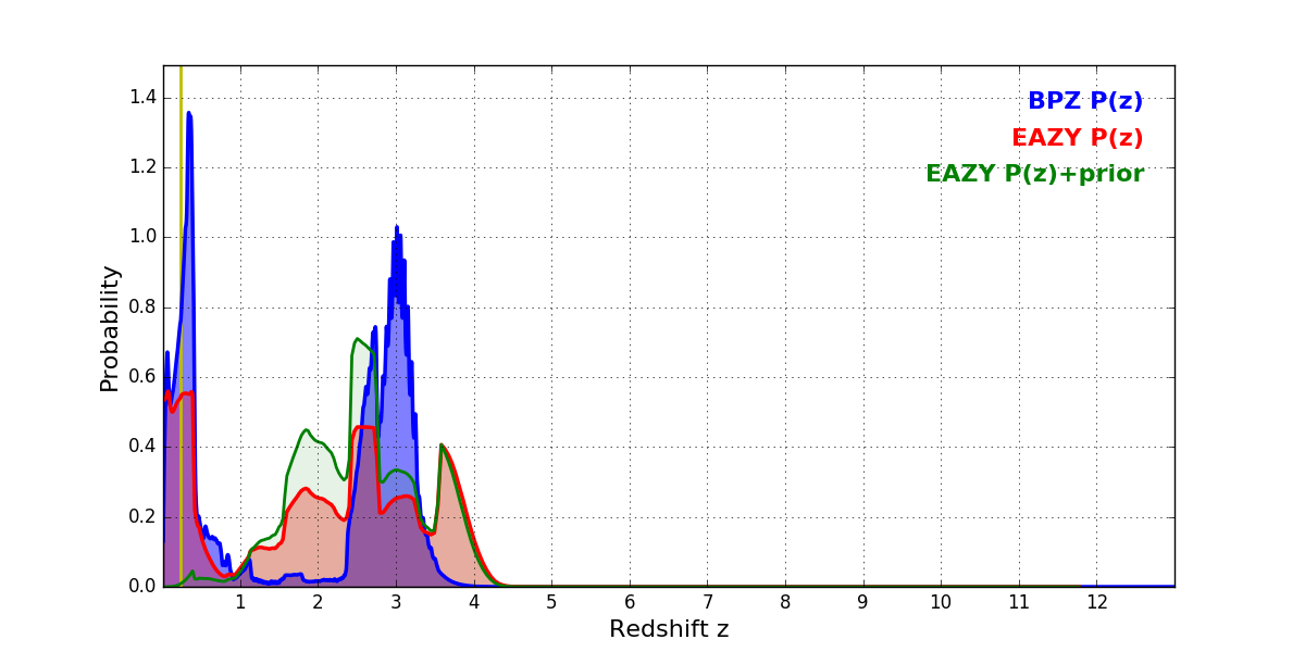 In P(z) plots: Yellow lines mark the cluster redshift z = 0.228,
