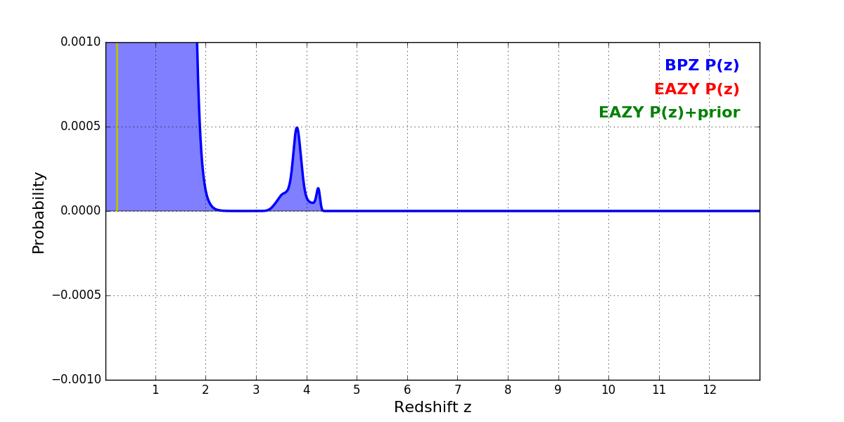 In P(z) plots: Yellow lines mark the cluster redshift z = 0.228,