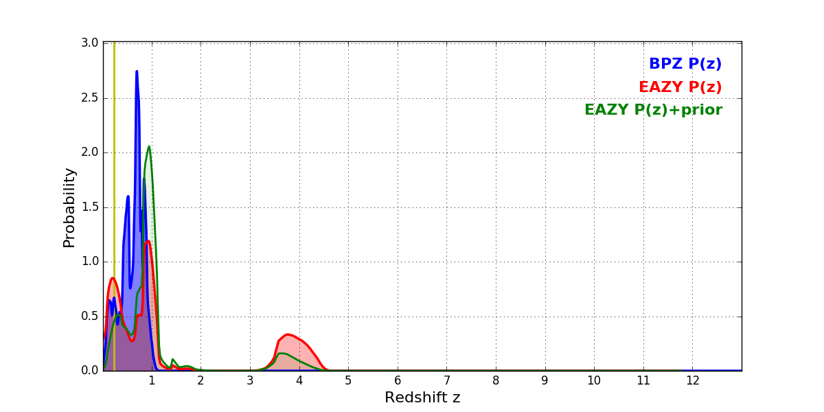 In P(z) plots: Yellow lines mark the cluster redshift z = 0.228,
