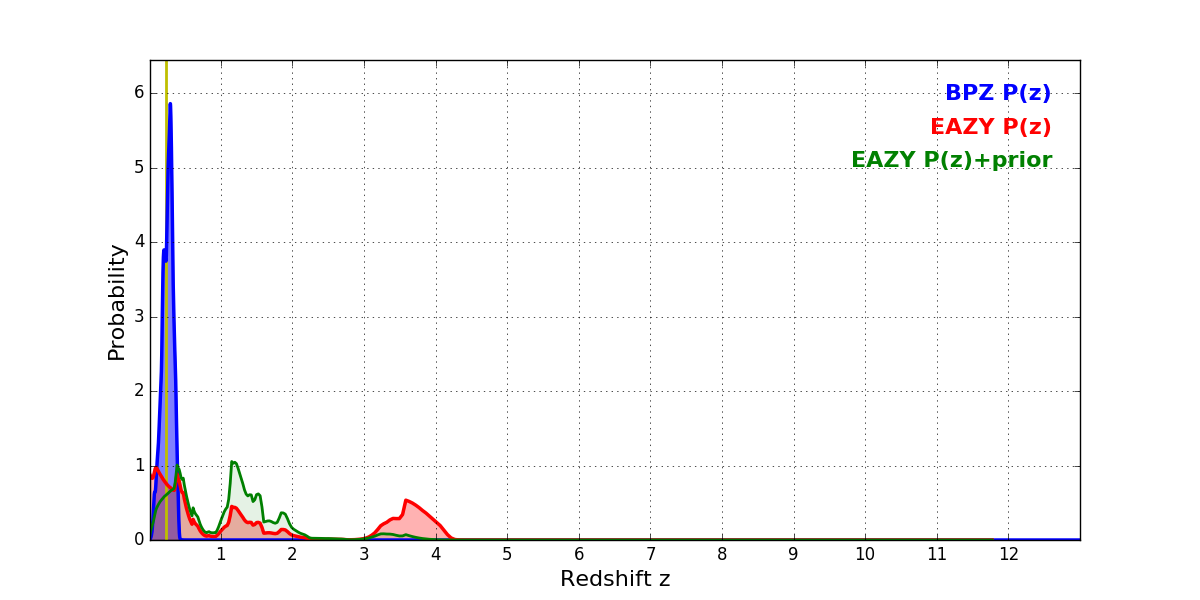 In P(z) plots: Yellow lines mark the cluster redshift z = 0.228,