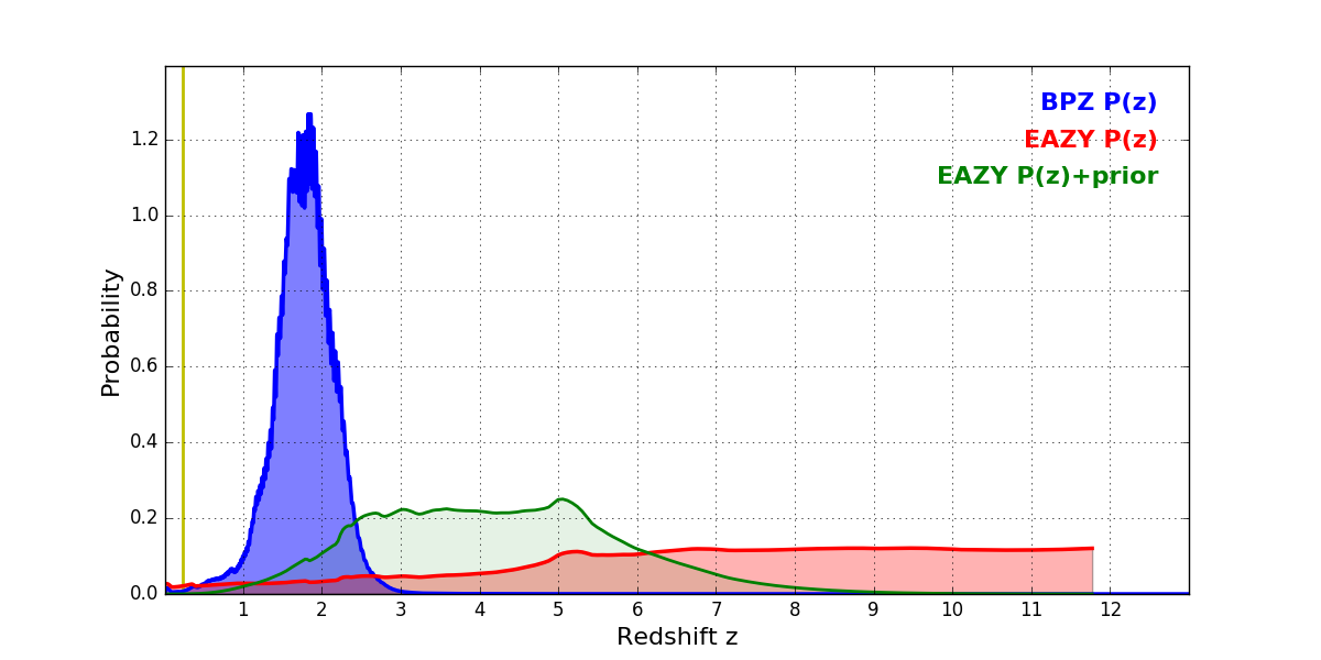 In P(z) plots: Yellow lines mark the cluster redshift z = 0.228,