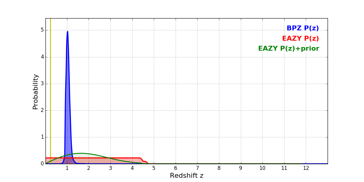 In P(z) plots: Yellow lines mark the cluster redshift z = 0.228,