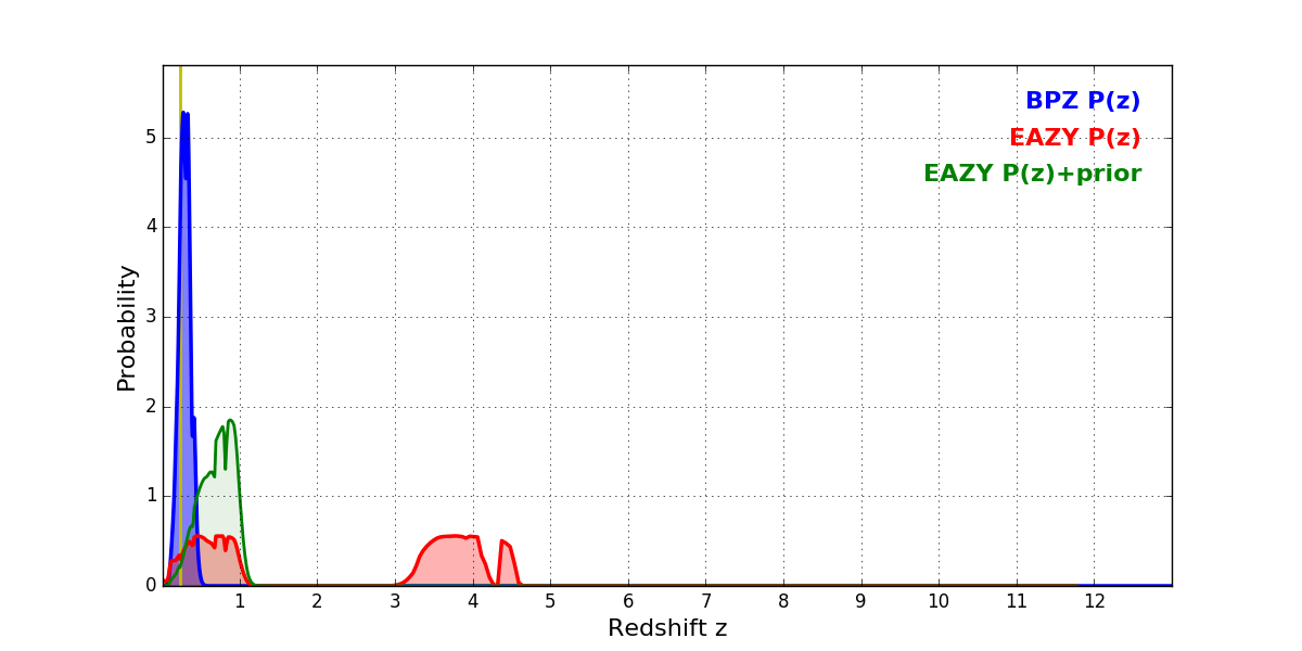 In P(z) plots: Yellow lines mark the cluster redshift z = 0.228,
