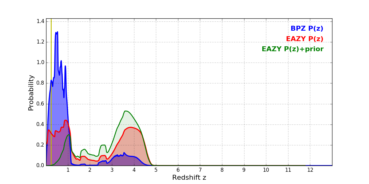 In P(z) plots: Yellow lines mark the cluster redshift z = 0.228,