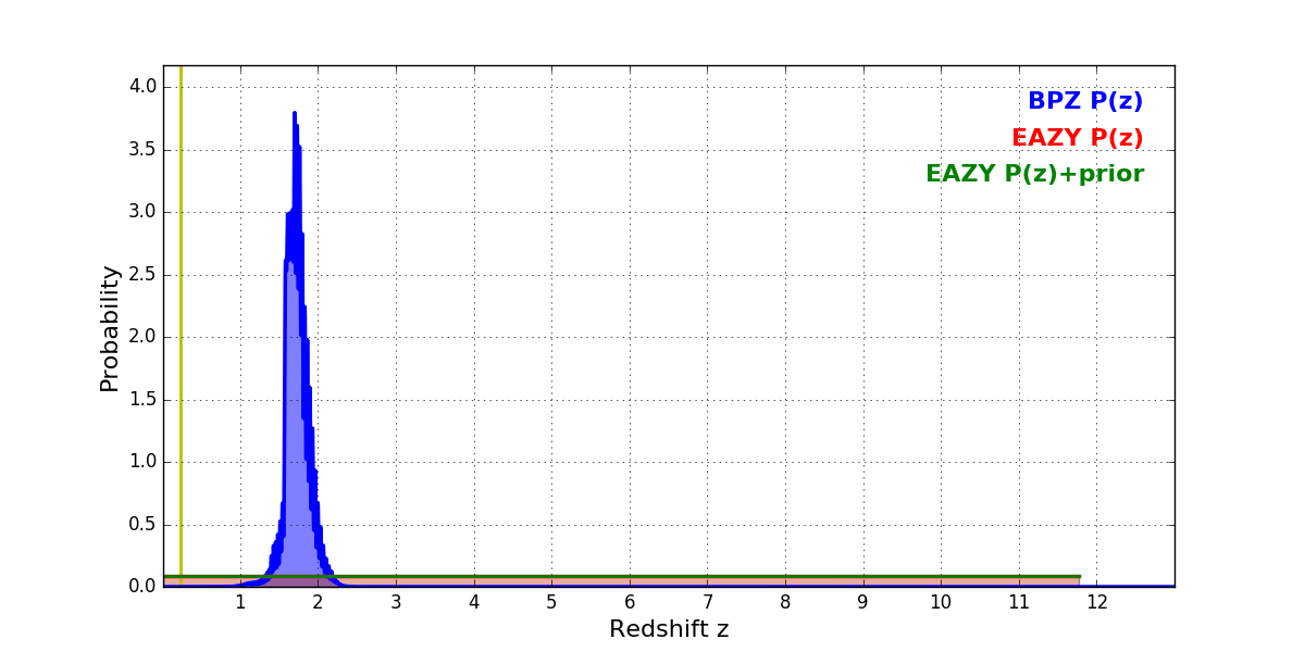 In P(z) plots: Yellow lines mark the cluster redshift z = 0.228,