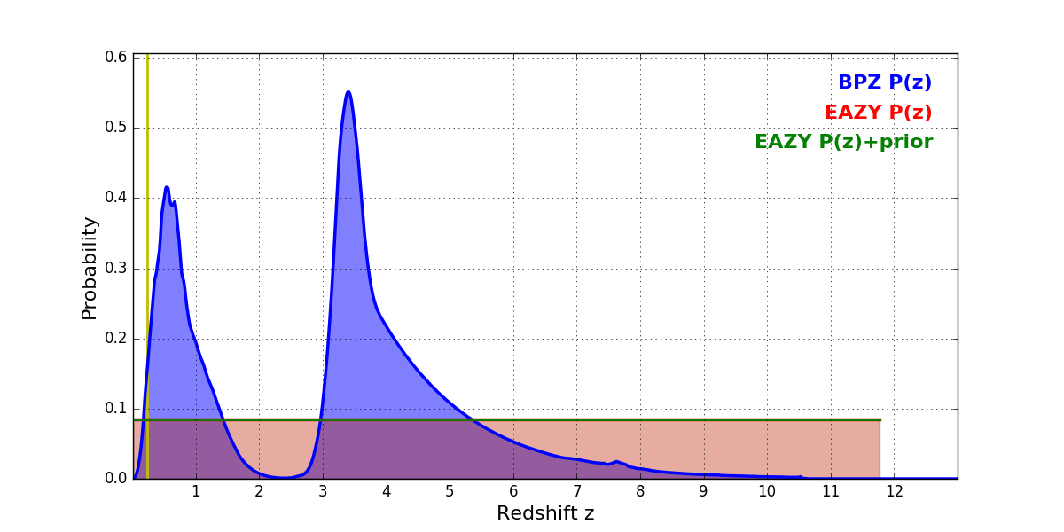 In P(z) plots: Yellow lines mark the cluster redshift z = 0.228,