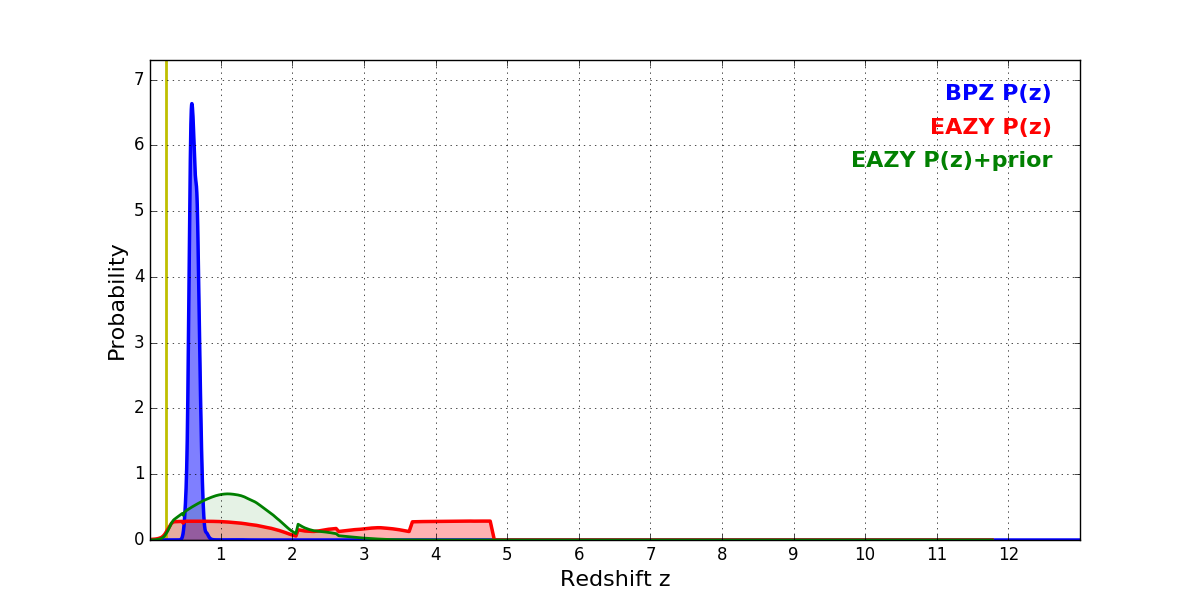 In P(z) plots: Yellow lines mark the cluster redshift z = 0.228,
