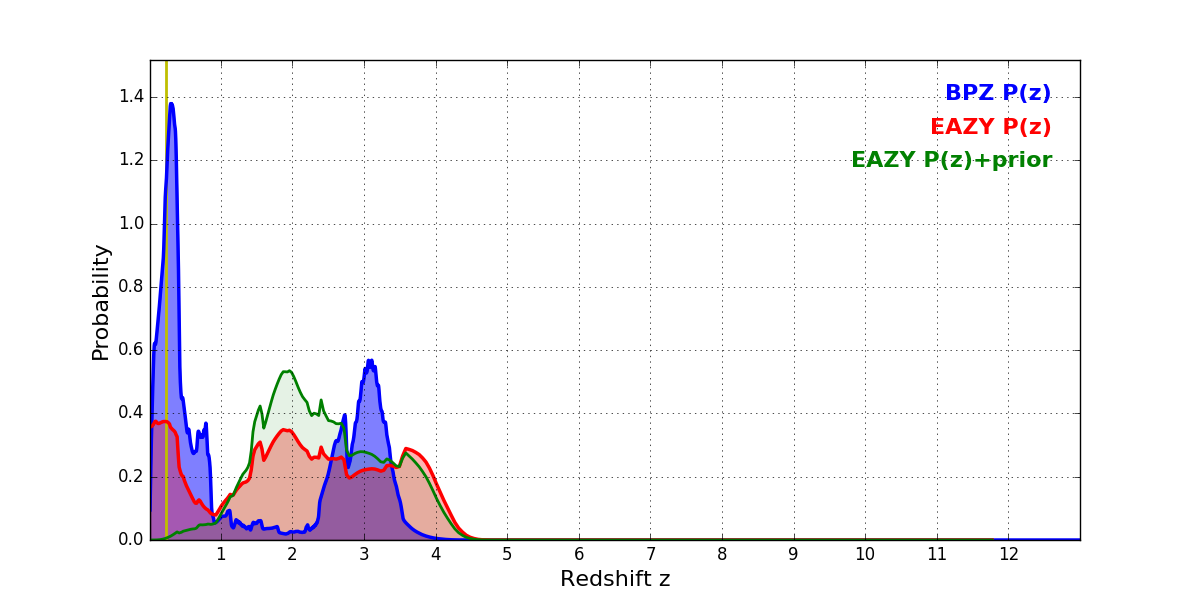 In P(z) plots: Yellow lines mark the cluster redshift z = 0.228,