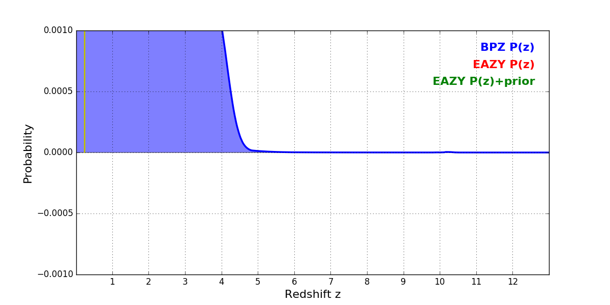 In P(z) plots: Yellow lines mark the cluster redshift z = 0.228,