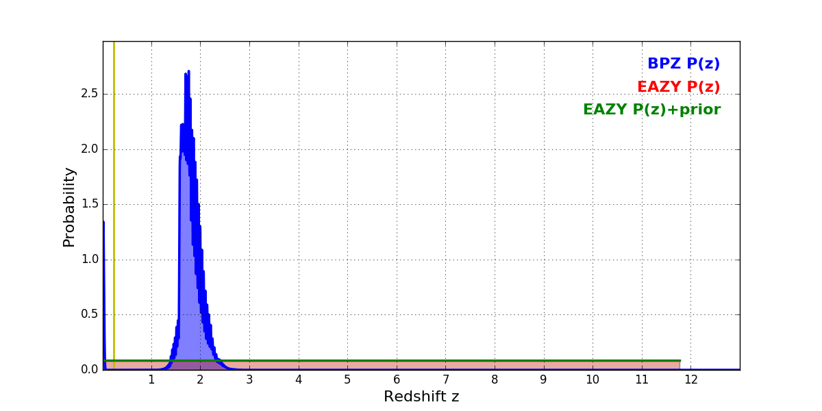 In P(z) plots: Yellow lines mark the cluster redshift z = 0.228,