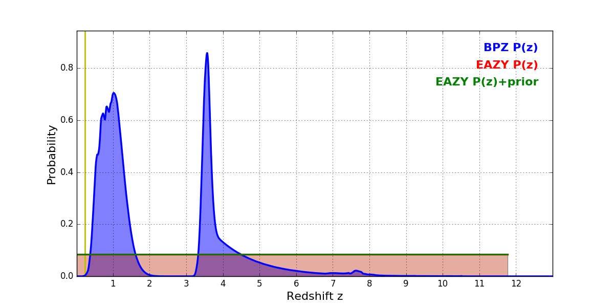 In P(z) plots: Yellow lines mark the cluster redshift z = 0.228,