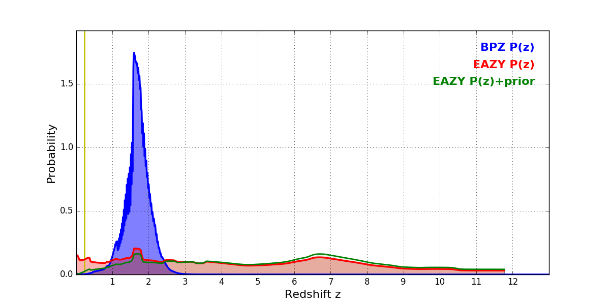 In P(z) plots: Yellow lines mark the cluster redshift z = 0.228,