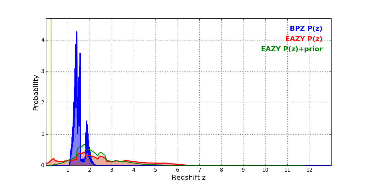 In P(z) plots: Yellow lines mark the cluster redshift z = 0.228,