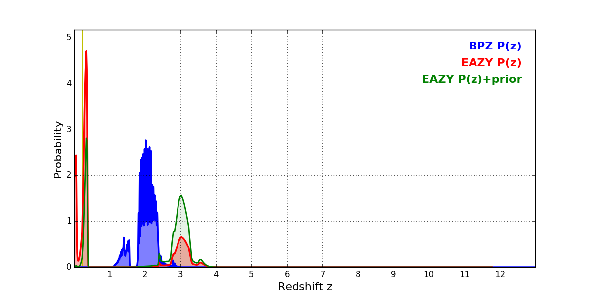 In P(z) plots: Yellow lines mark the cluster redshift z = 0.228,