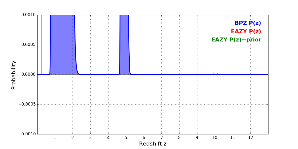 In P(z) plots: Yellow lines mark the cluster redshift z = 0.228,