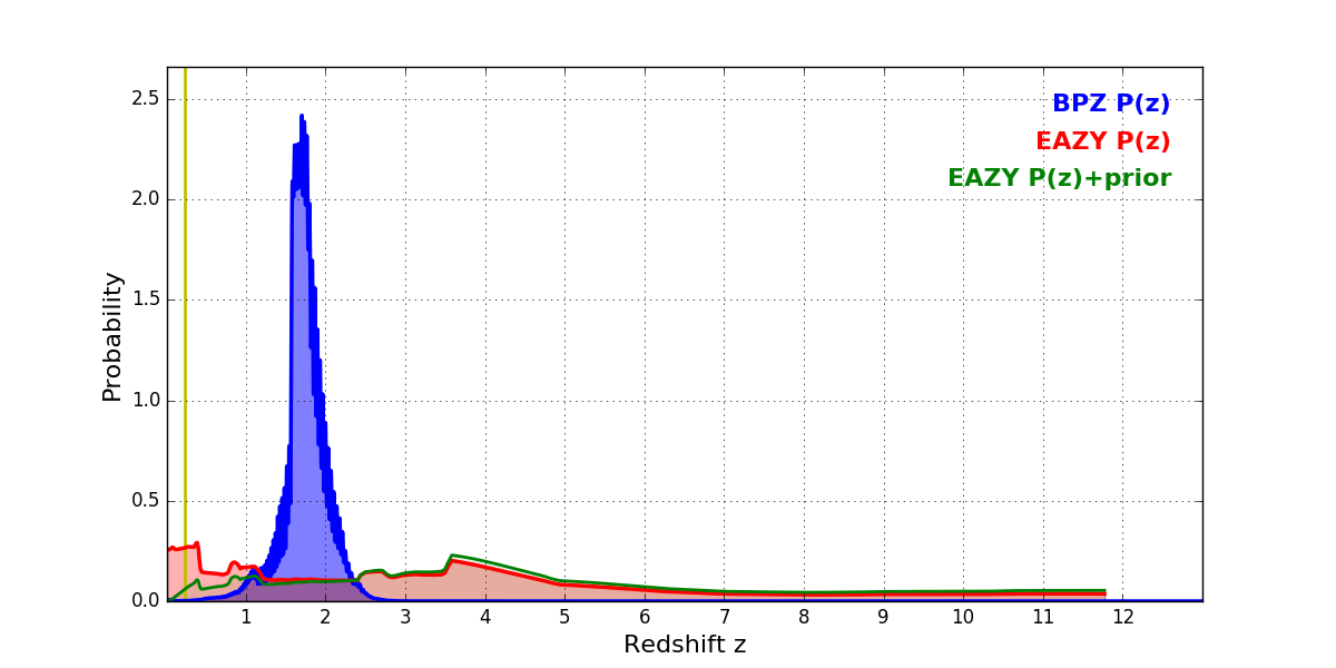 In P(z) plots: Yellow lines mark the cluster redshift z = 0.228,