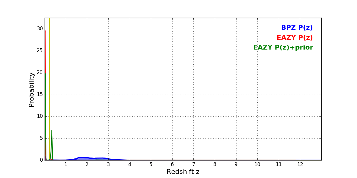 In P(z) plots: Yellow lines mark the cluster redshift z = 0.228,