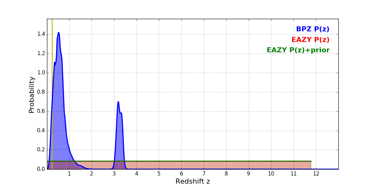 In P(z) plots: Yellow lines mark the cluster redshift z = 0.228,
