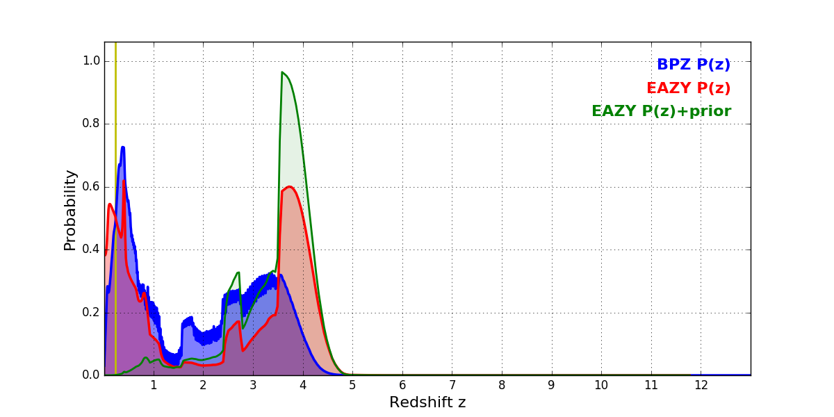 In P(z) plots: Yellow lines mark the cluster redshift z = 0.228,