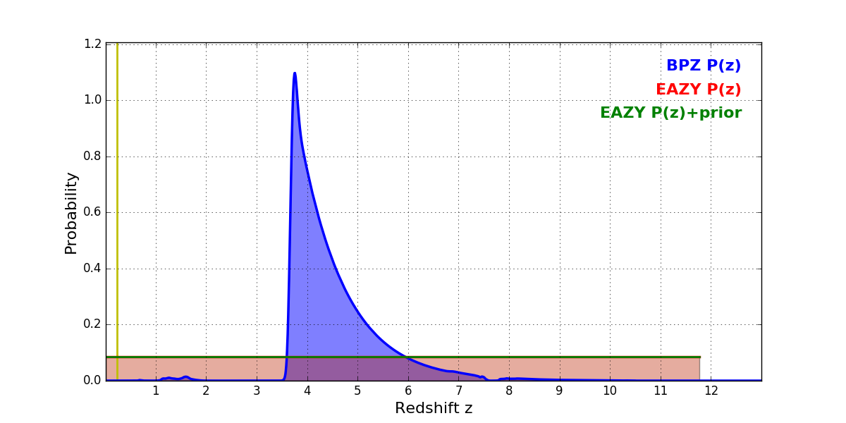 In P(z) plots: Yellow lines mark the cluster redshift z = 0.228,