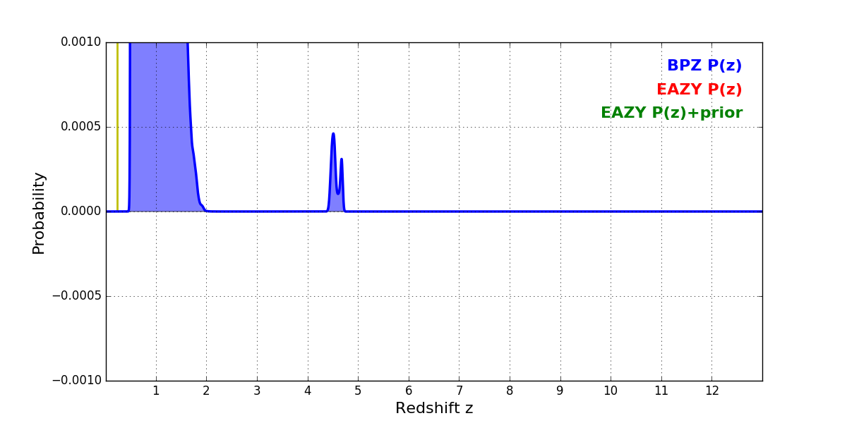 In P(z) plots: Yellow lines mark the cluster redshift z = 0.228,