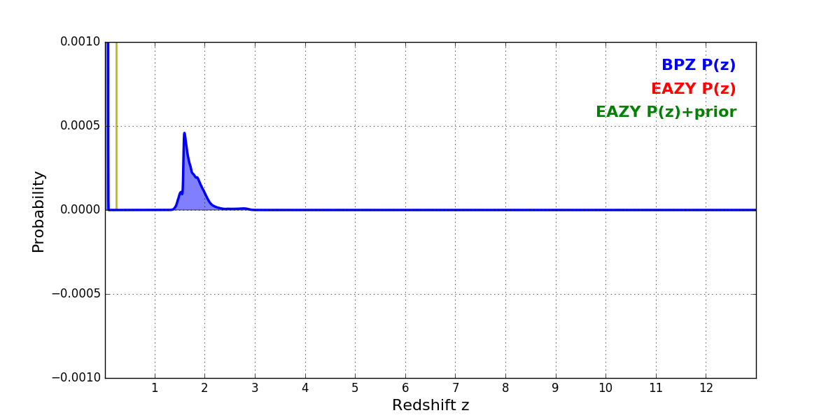 In P(z) plots: Yellow lines mark the cluster redshift z = 0.228,