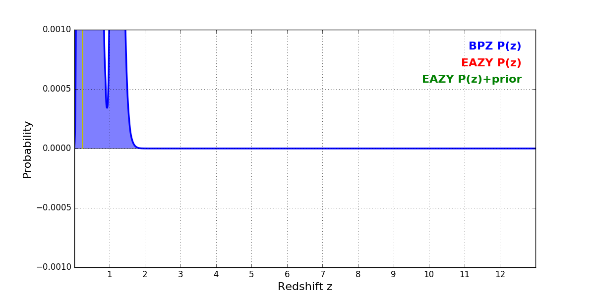 In P(z) plots: Yellow lines mark the cluster redshift z = 0.228,