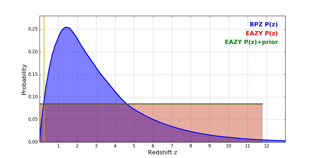 In P(z) plots: Yellow lines mark the cluster redshift z = 0.228,