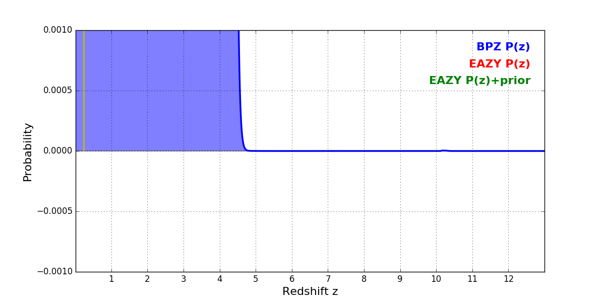 In P(z) plots: Yellow lines mark the cluster redshift z = 0.228,