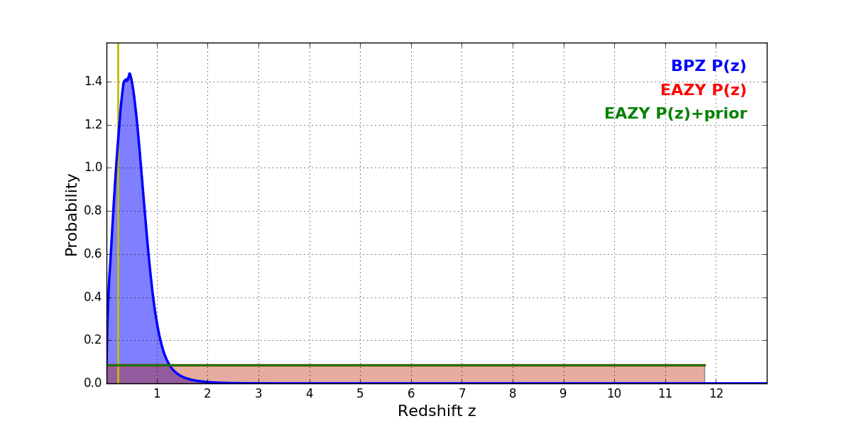 In P(z) plots: Yellow lines mark the cluster redshift z = 0.228,