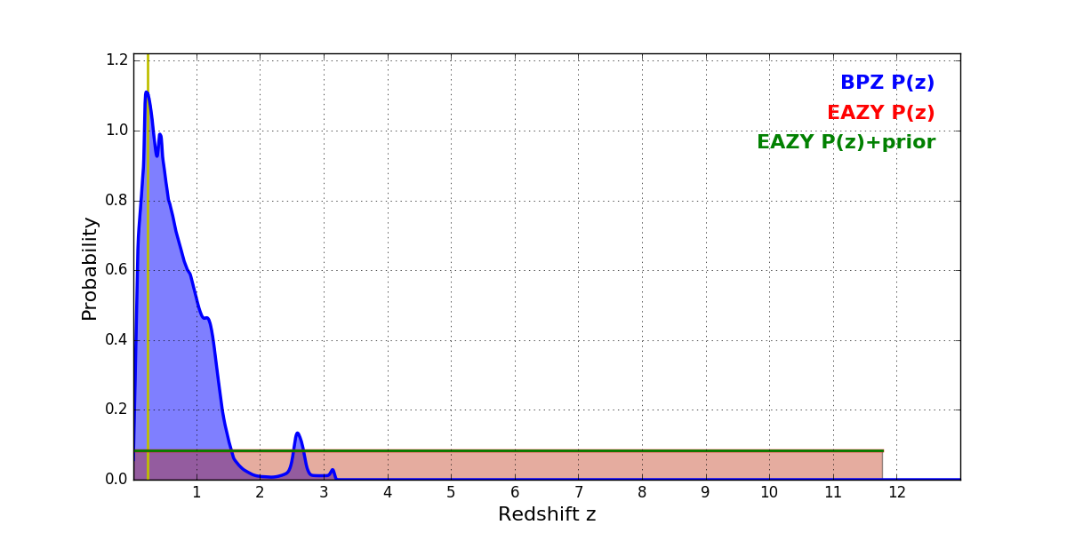 In P(z) plots: Yellow lines mark the cluster redshift z = 0.228,