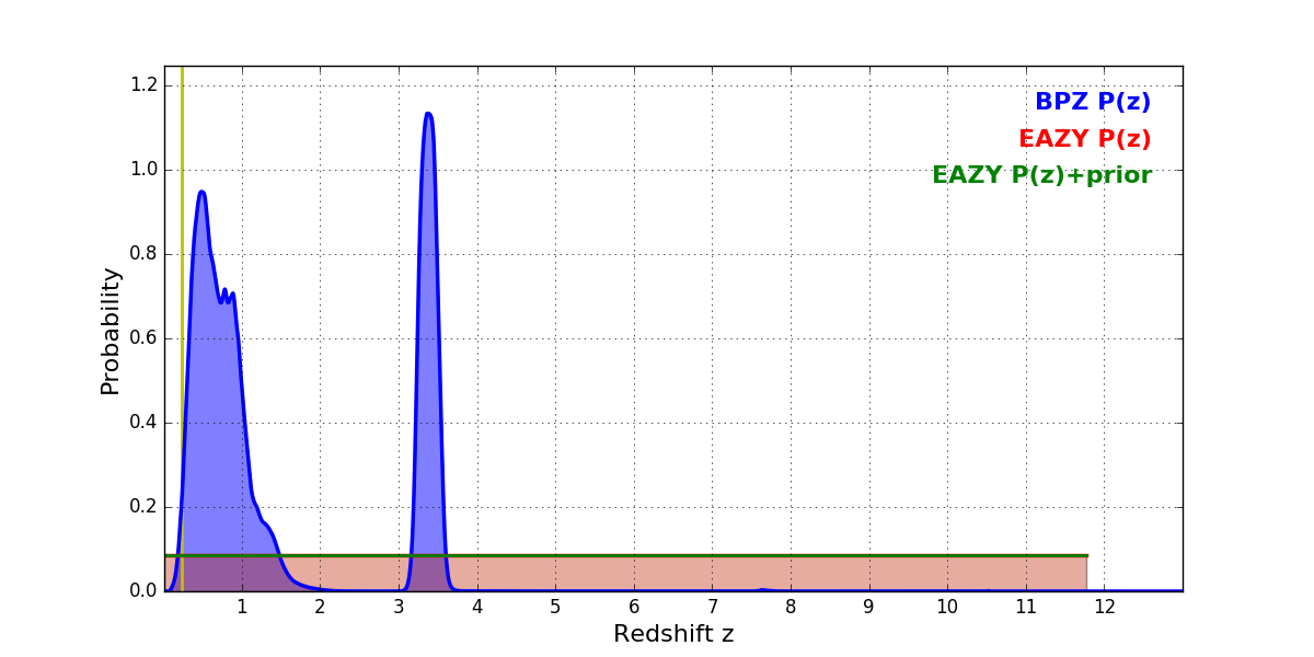 In P(z) plots: Yellow lines mark the cluster redshift z = 0.228,