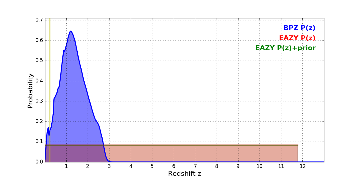 In P(z) plots: Yellow lines mark the cluster redshift z = 0.228,