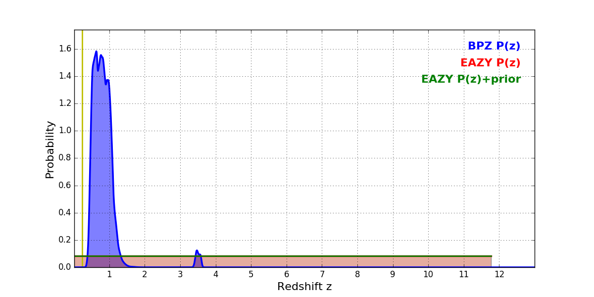 In P(z) plots: Yellow lines mark the cluster redshift z = 0.228,
