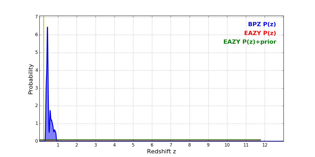In P(z) plots: Yellow lines mark the cluster redshift z = 0.228,