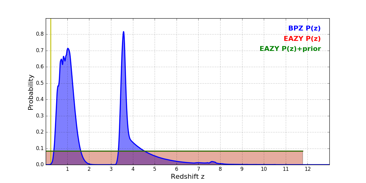 In P(z) plots: Yellow lines mark the cluster redshift z = 0.228,