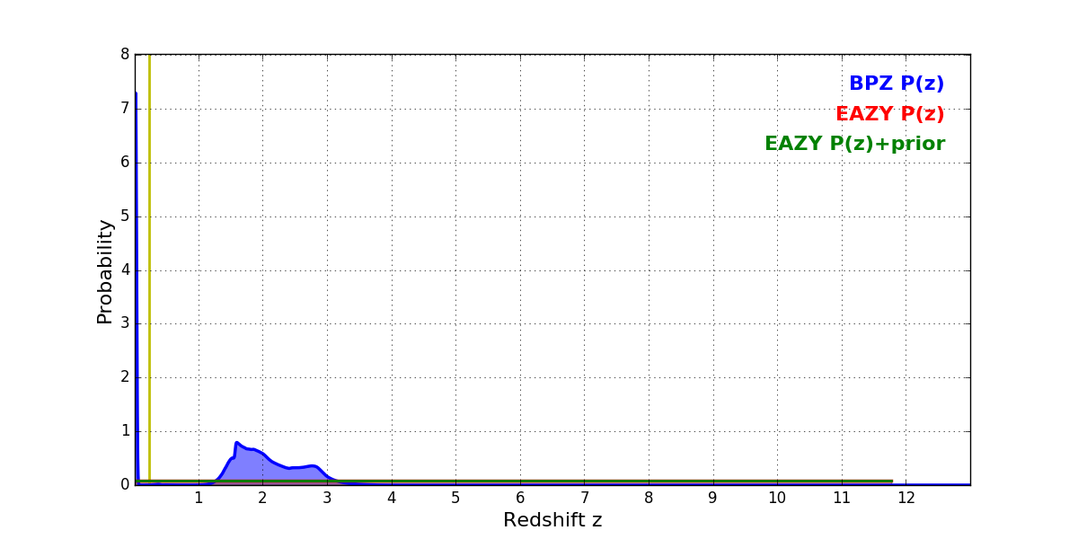 In P(z) plots: Yellow lines mark the cluster redshift z = 0.228,
