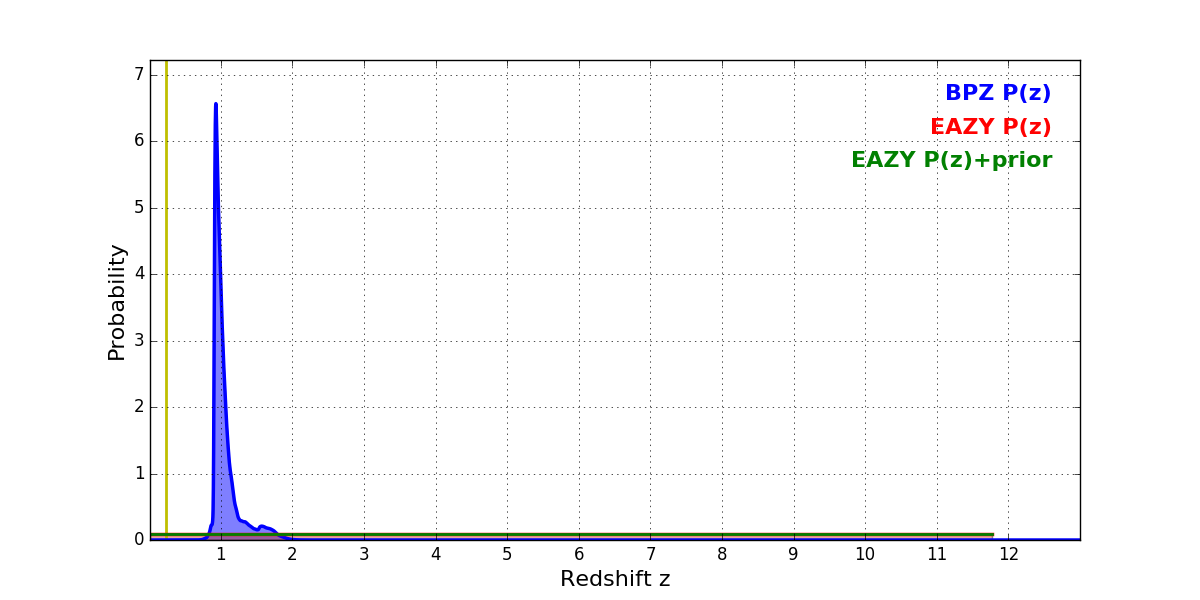 In P(z) plots: Yellow lines mark the cluster redshift z = 0.228,