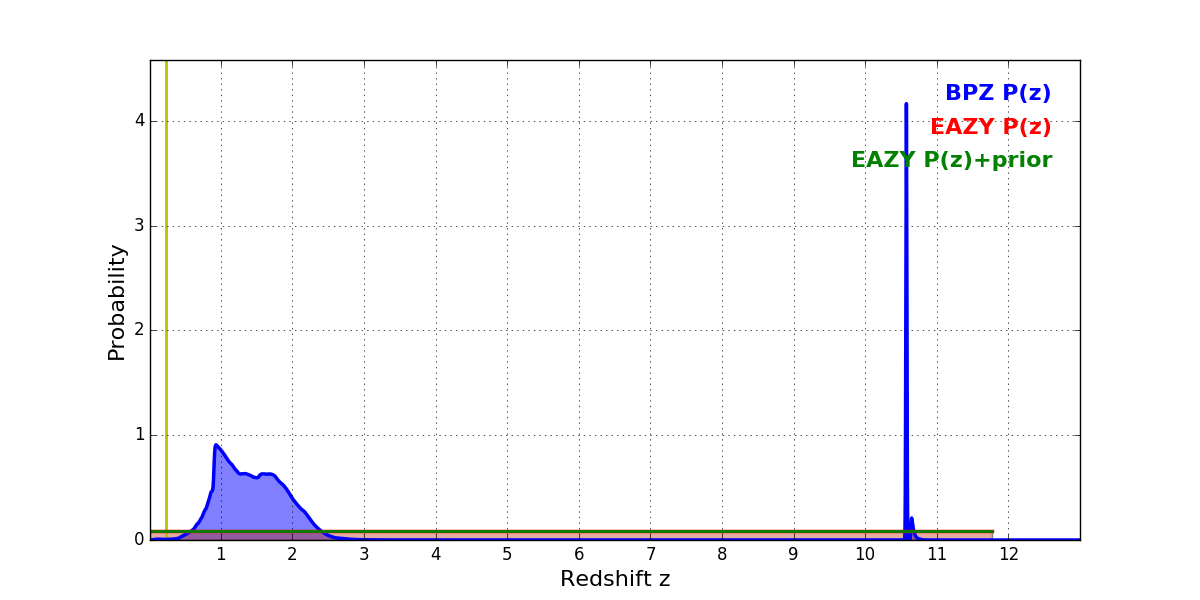 In P(z) plots: Yellow lines mark the cluster redshift z = 0.228,