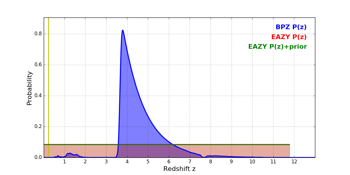 In P(z) plots: Yellow lines mark the cluster redshift z = 0.228,