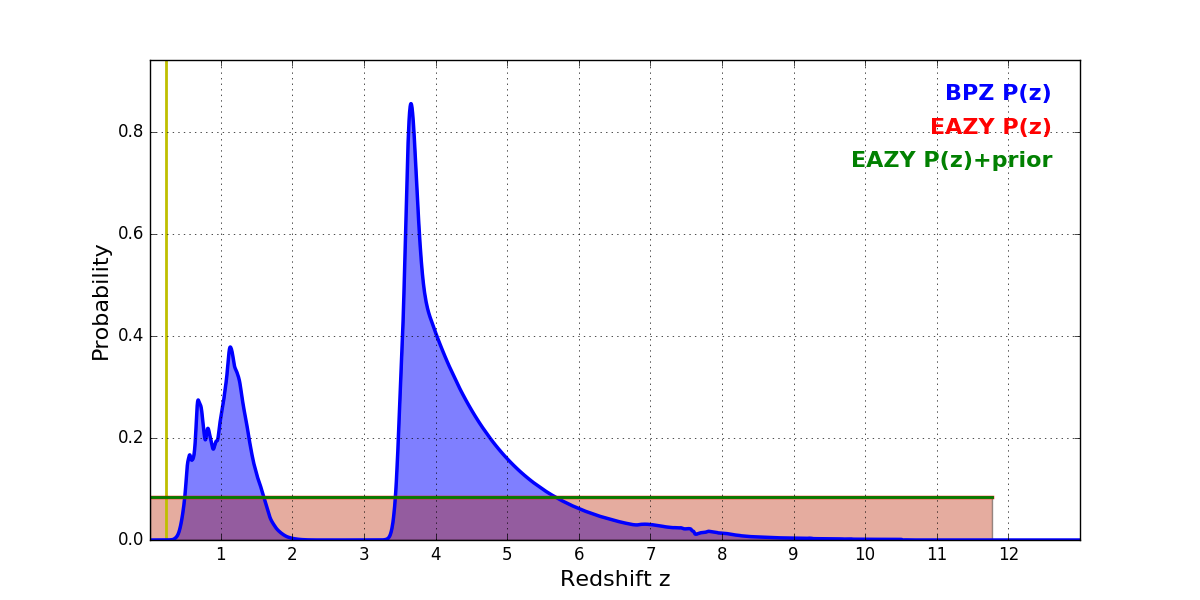 In P(z) plots: Yellow lines mark the cluster redshift z = 0.228,