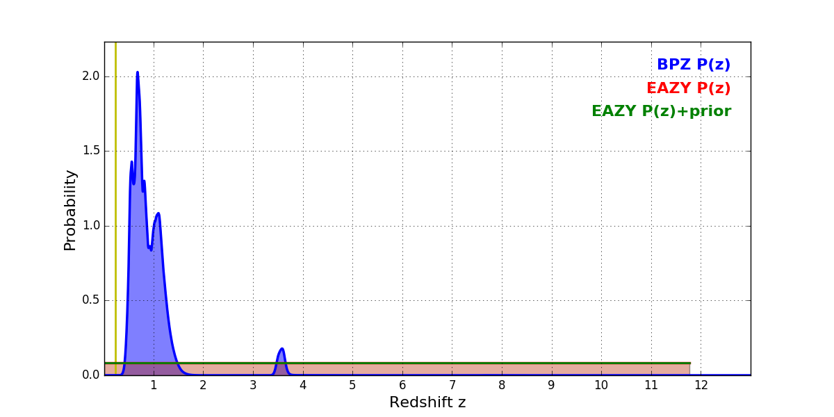 In P(z) plots: Yellow lines mark the cluster redshift z = 0.228,