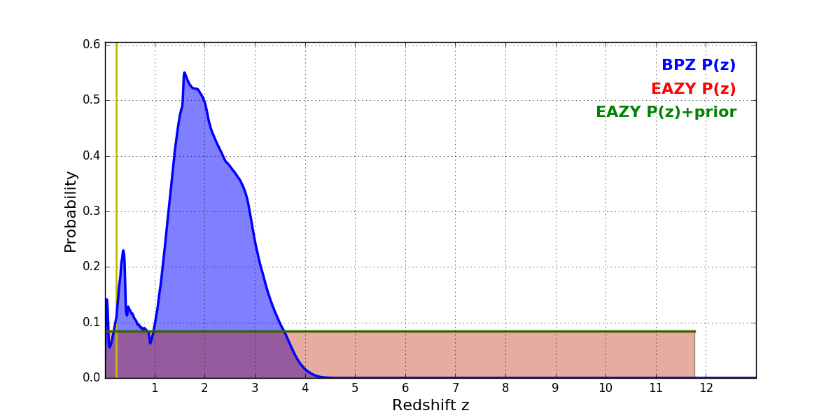 In P(z) plots: Yellow lines mark the cluster redshift z = 0.228,
