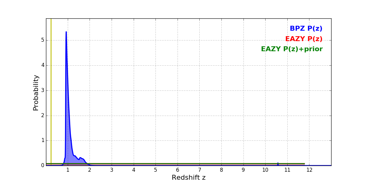 In P(z) plots: Yellow lines mark the cluster redshift z = 0.228,