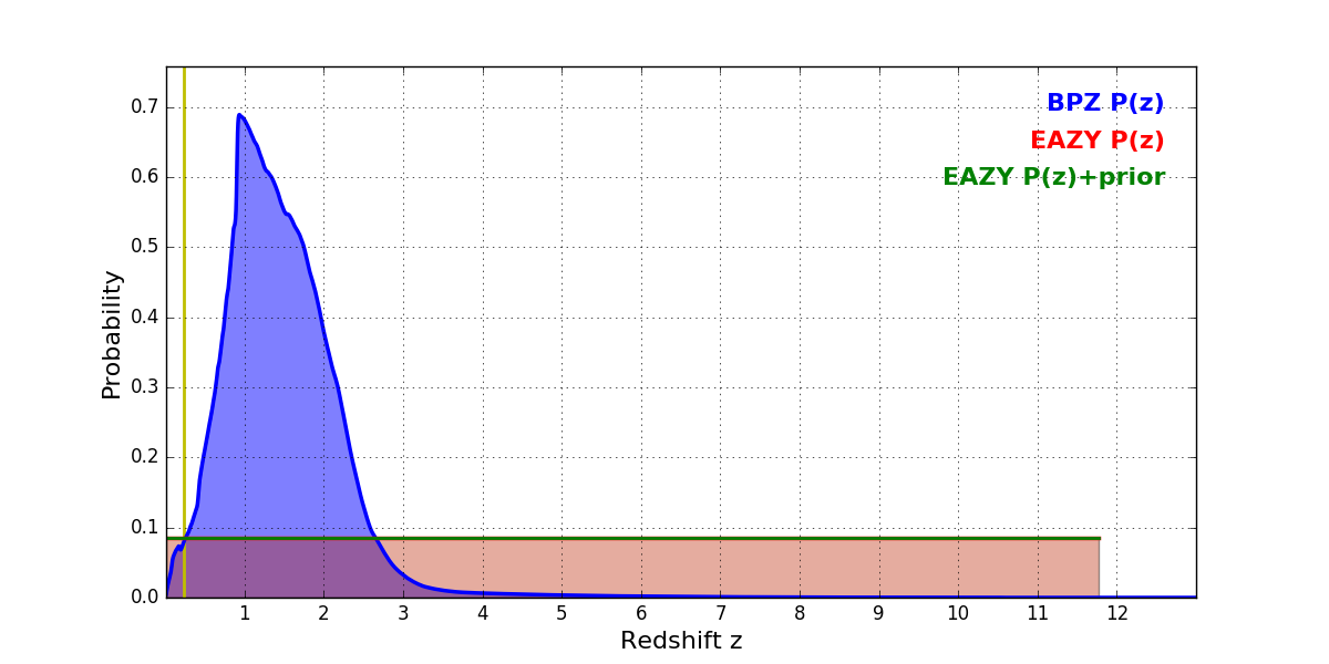 In P(z) plots: Yellow lines mark the cluster redshift z = 0.228,