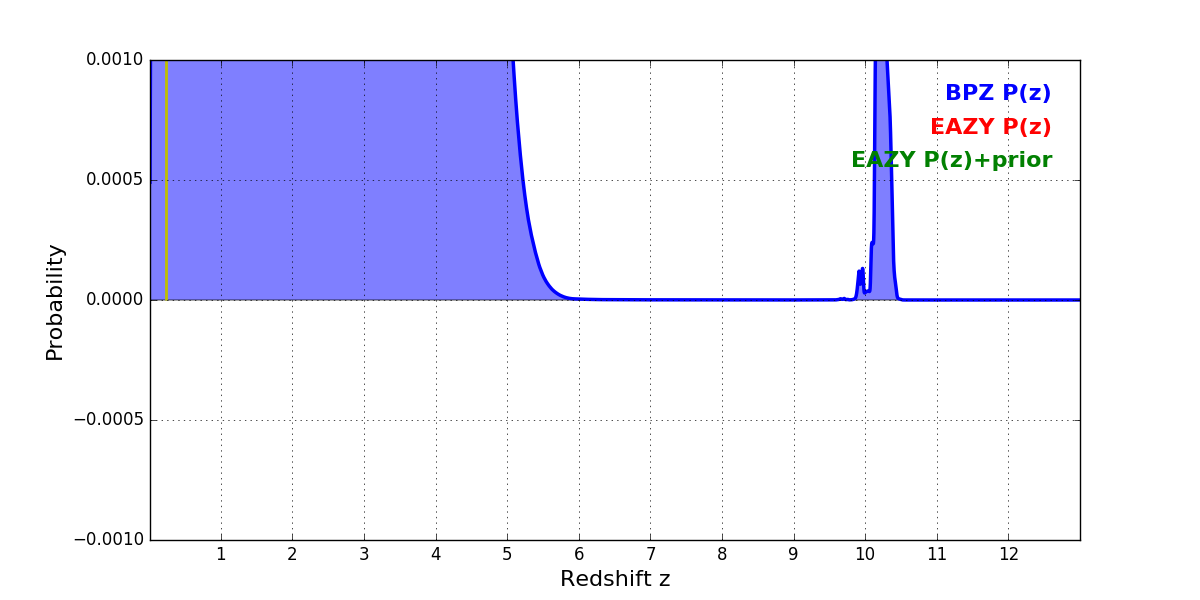 In P(z) plots: Yellow lines mark the cluster redshift z = 0.228,