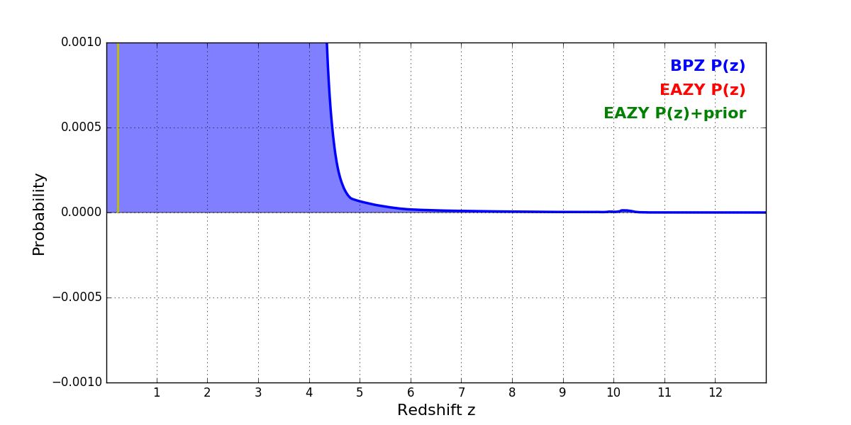 In P(z) plots: Yellow lines mark the cluster redshift z = 0.228,